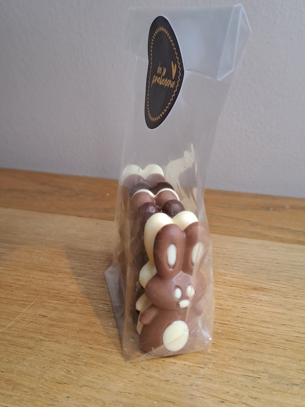 Zakje met 8 figuurtjes (halve paashaasjes) van volle chocolade in de 3 kleuren van chocolade (wit, melk en puur).